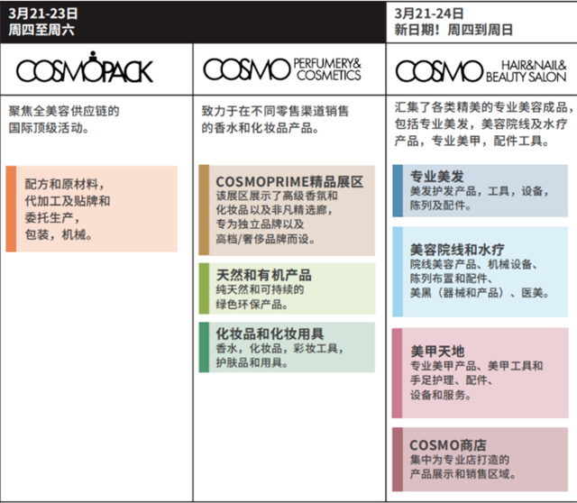 COSMOPROF卡思曼伯意大利博洛尼亞美容展包含三大主題展區(qū),每個展區(qū)都專注于特定行業(yè)和分銷渠道。