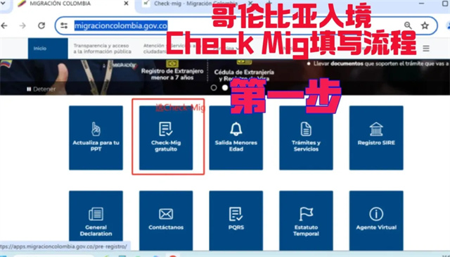 圖一,打開網址:https://www.migracioncolombia.gov.co/,選擇“Check-Mig”。 (網站比較不穩定,可以嘗試翻墻,多換幾個瀏覽器,比如 google 瀏覽器、360 極速瀏覽器)